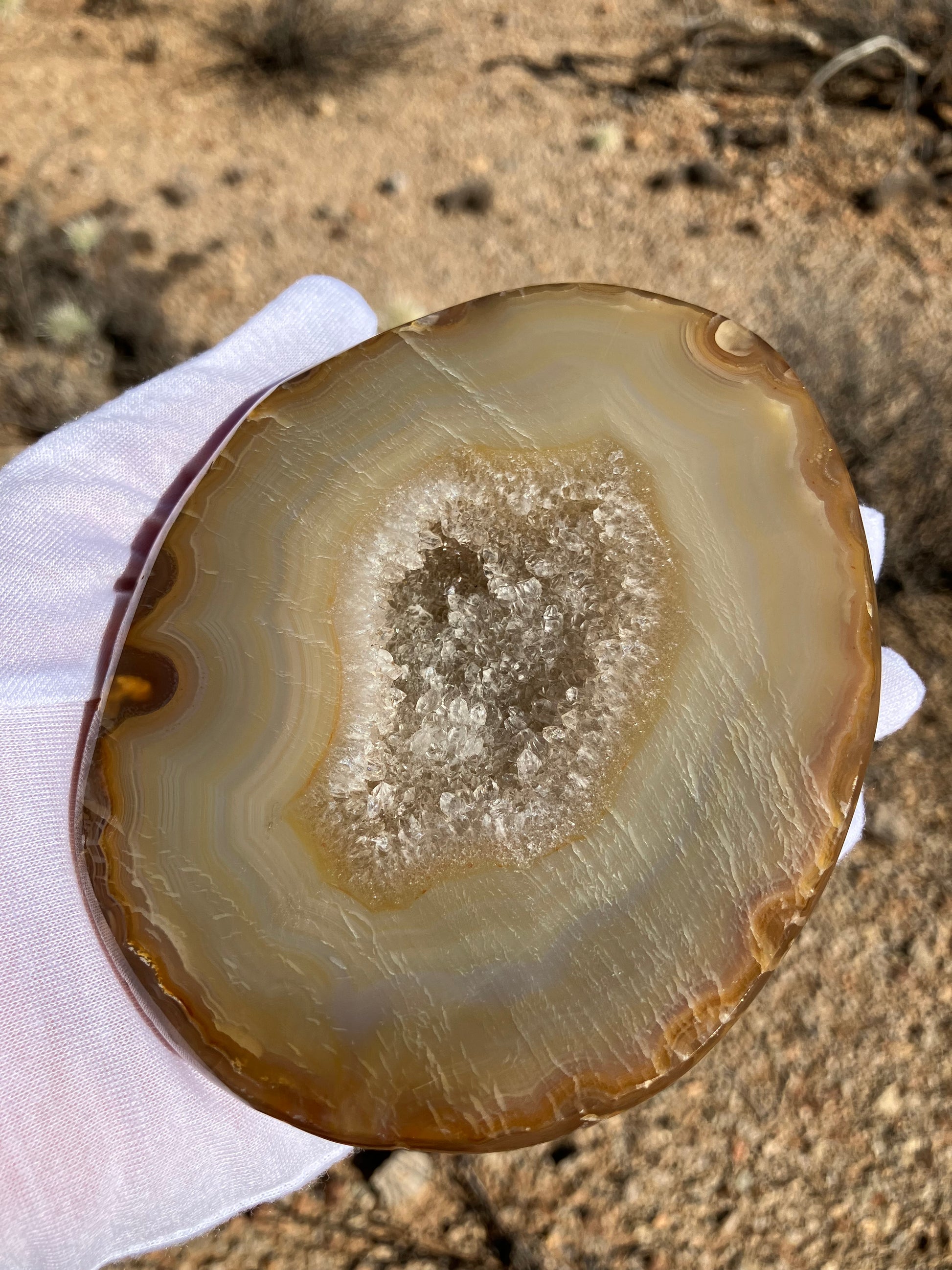 The crystalline druzy formation in the middle of the geode is its most impressive feature. Formed naturally over thousands of years, the tiny quartz crystals clustered together create a one-of-a-kind work of art. The crystals sparkle brilliantly when they catch the light.