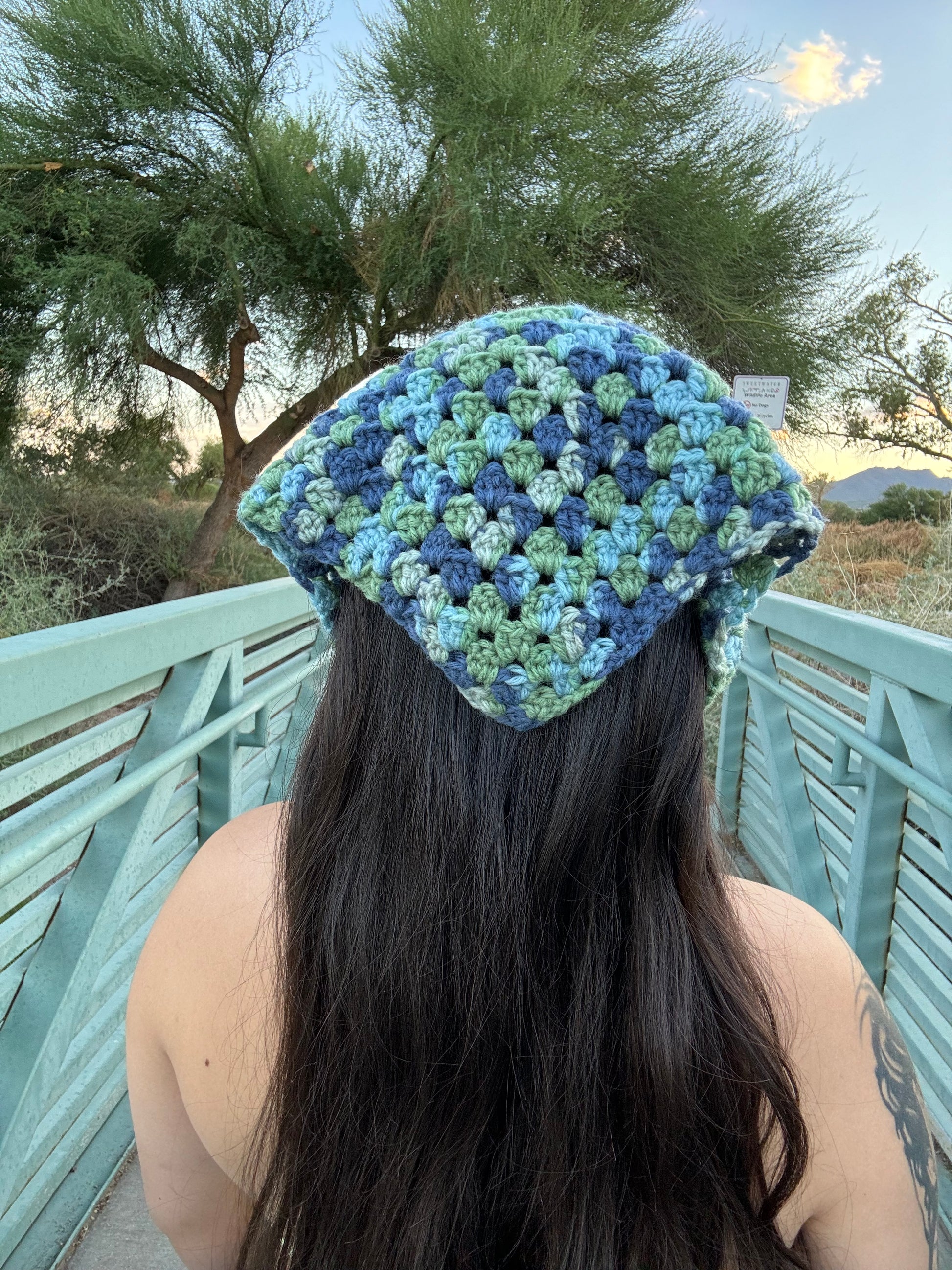 Fully handmade blue and green crochet bandana hair accessory. Features a tie at the back of the neck for adjustment. Fits adult size M/L. You can find an assortment of colors in our shop or email us for custom color and measurements.