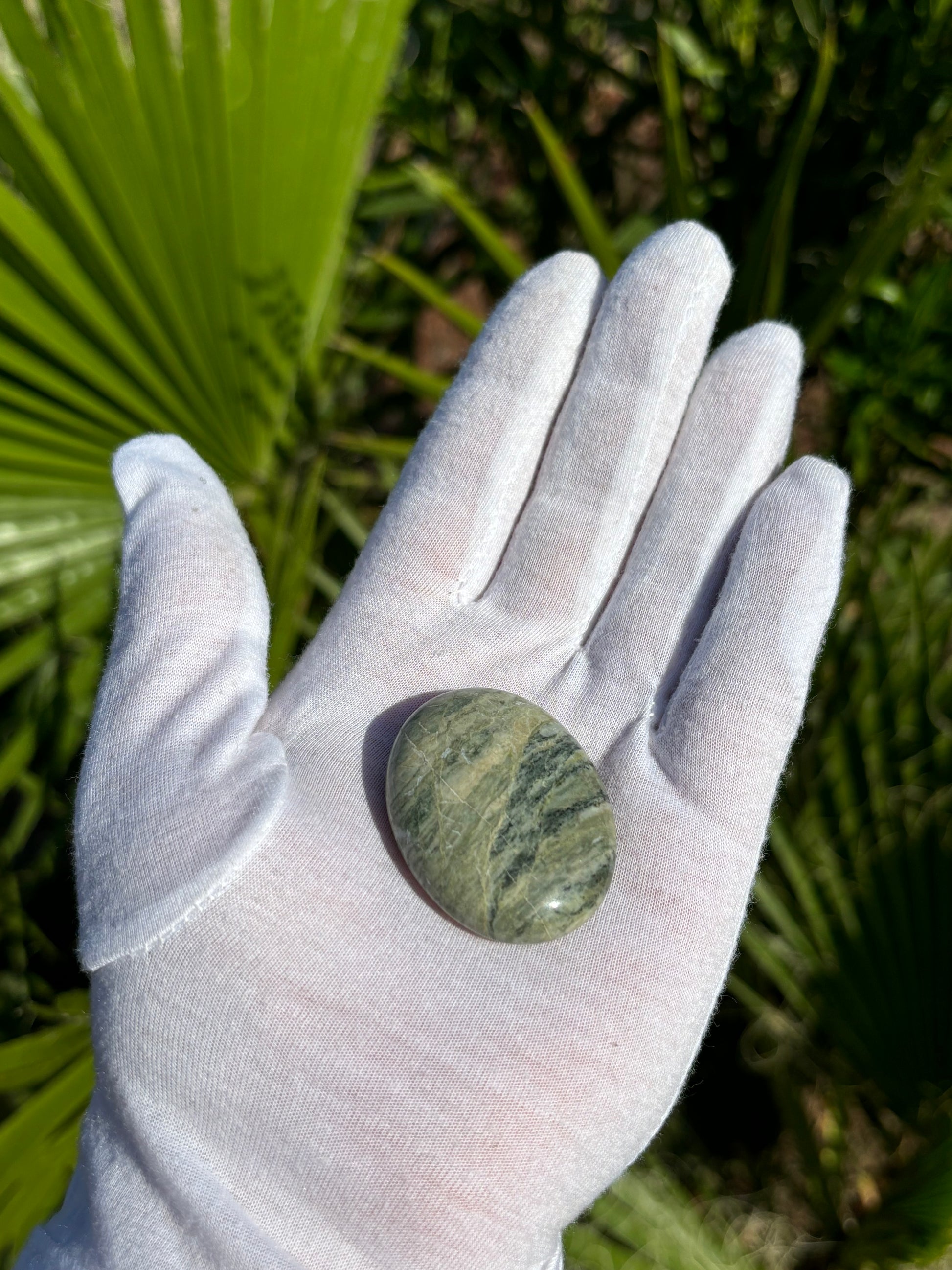 Our Green Jasper Palm Stone is a stunning addition to any crystal collection. The stone is carefully crafted to showcase intricate green hair-like patterns, making each piece truly unique. Green Jasper is an excellent talisman for those coping with paranoid delusions, entity attachments, or who feel overwhelmed by nightmares. Wear or carry as a rubbing stone to ward off negative energy, bring reassurance, and help restore inner calmness.