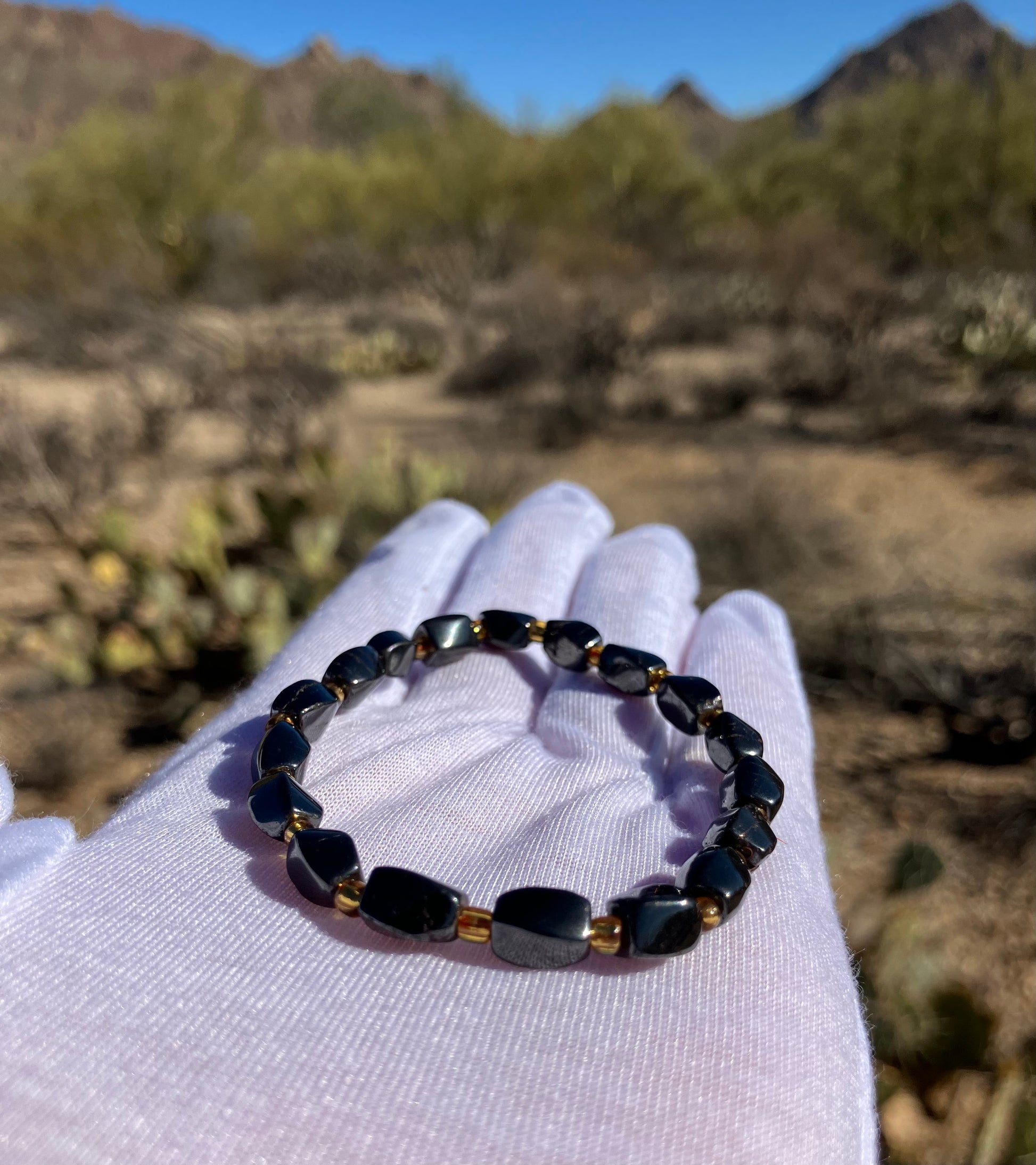 - Made with natural hematite beads known for their metallic sheen