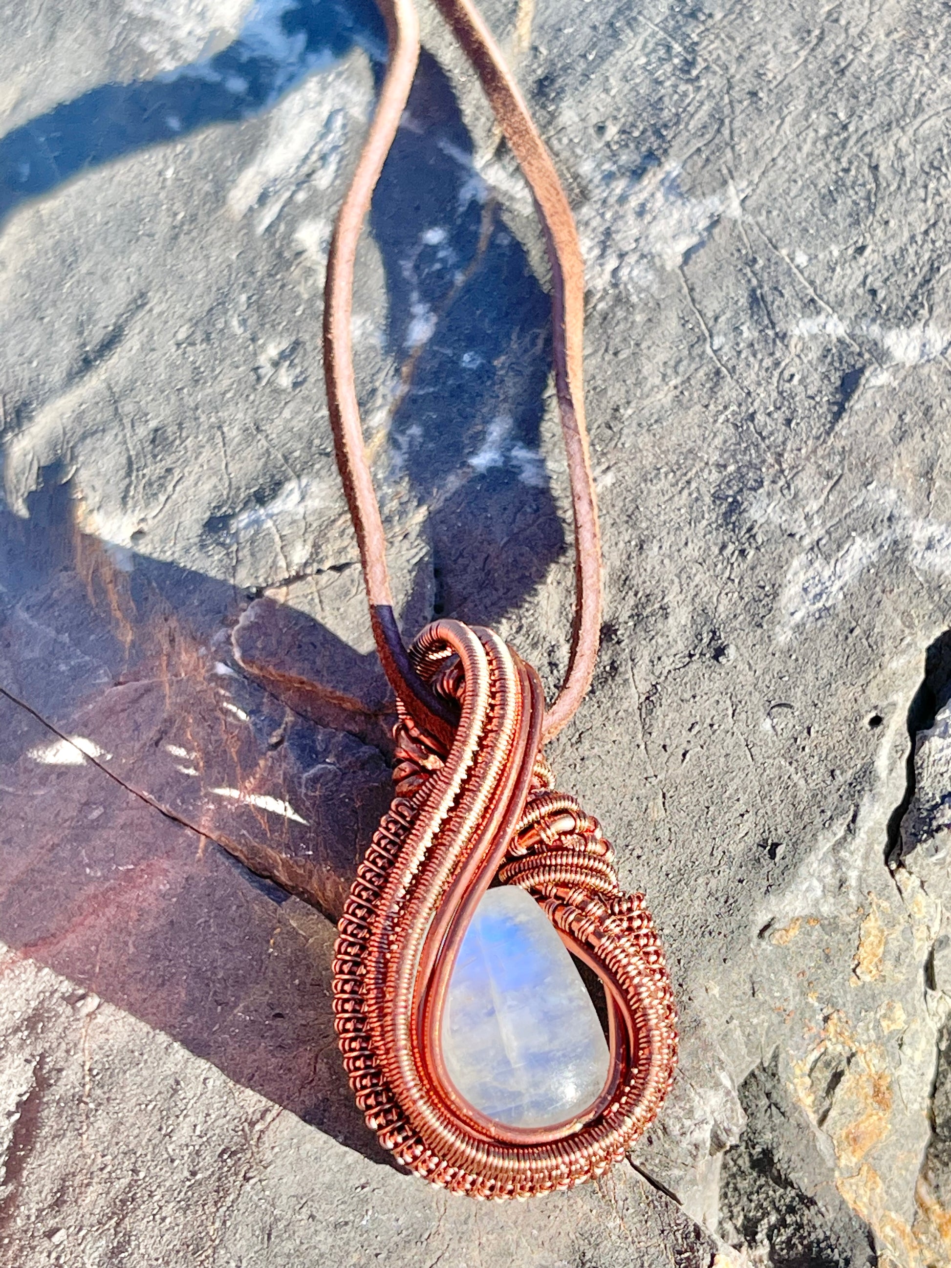 This one of a kind Moonstone wire wrap is not only a beautiful accessory but also holds symbolic meaning. Moonstone is believed to possess powerful healing properties and is associated with feminine energy and intuition. Wearing this pendant can help enhance your intuition, promote emotional balance, and bring a sense of calmness and harmony into your life.
