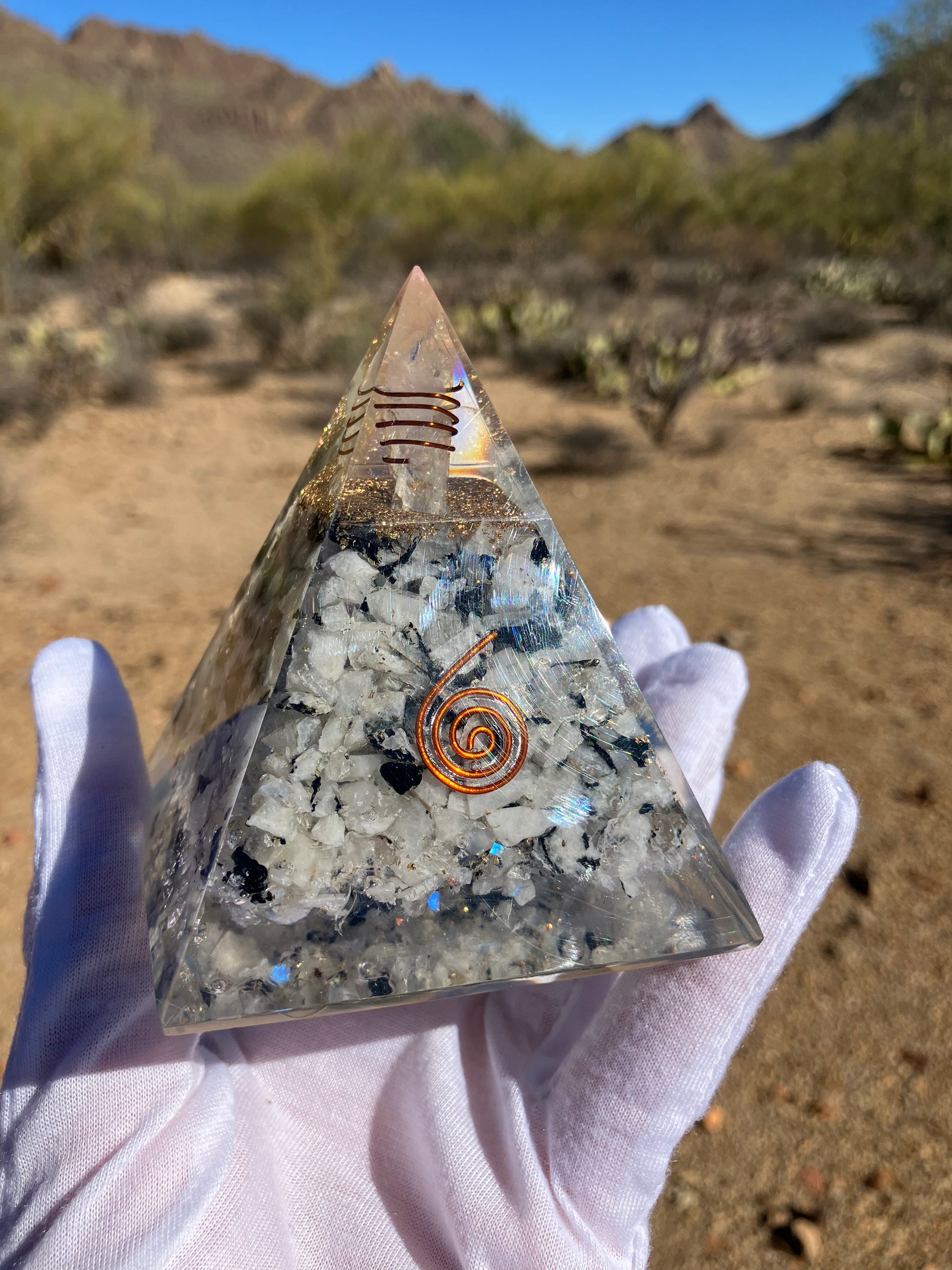 Harness the healing potential of Orgonite, Rainbow Moonstone, Quartz and Copper in a captivating desktop accessory. Perfect for crystal lovers, spiritual seekers, and anyone looking to enhance harmony and positive vibes. Bring some beautiful magic into your life with this Orgonite Pyramid today.