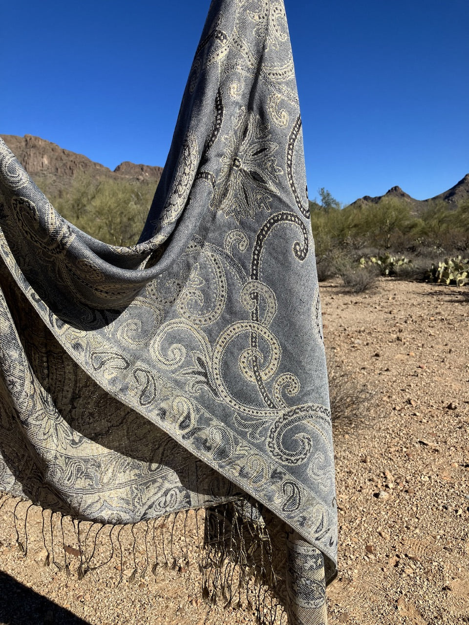 This gorgeous pashmina is perfect for adding a touch of glamour to any outfit. The soft, flowing fabric provides lightweight warmth while the vibrant colors and unique paisley print make a bold fashion statement. Tie it around your neck to display the pattern or wrap it around your shoulders for a stylish shawl. The oversized dimensions allow for multiple wearing options.