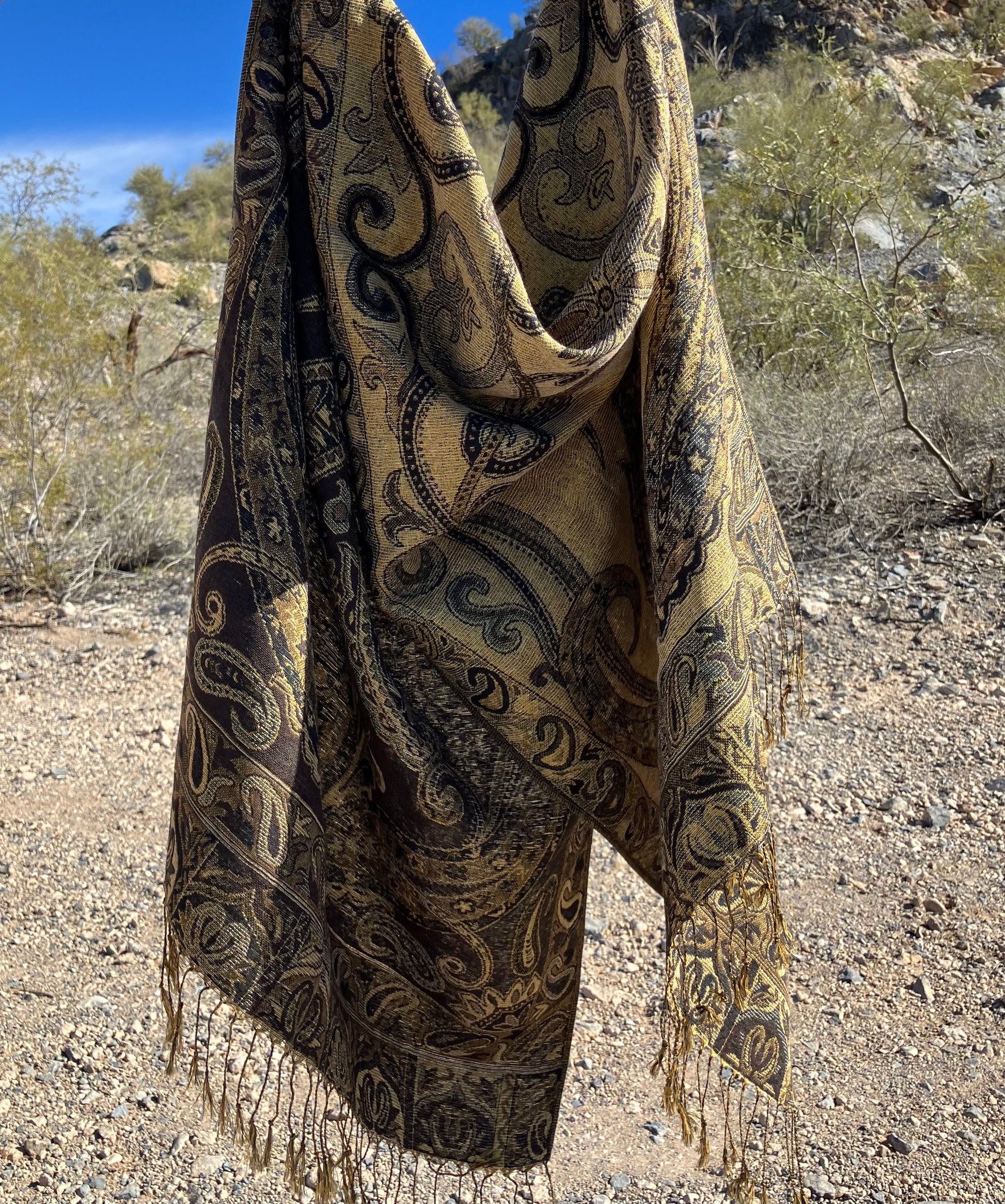 This gorgeous pashmina is perfect for adding a touch of glamour to any outfit. The soft, flowing fabric provides lightweight warmth while the vibrant colors and unique paisley print make a bold fashion statement. Tie it around your neck to display the pattern or wrap it around your shoulders for a stylish shawl. The oversized dimensions allow for multiple wearing options.
